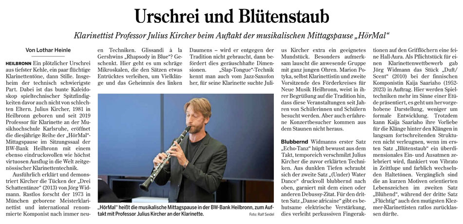Prof. Julius Kircher spielt Duft: Blütenstaub, Blühend, Flüchtig (2010) von Kaija A. Saariaho und Drei Schattentänze: Echo-Tanz, (Under) Water Dance, Danse Africaine (2013) von Jörg Widmann für Klarinette solo.